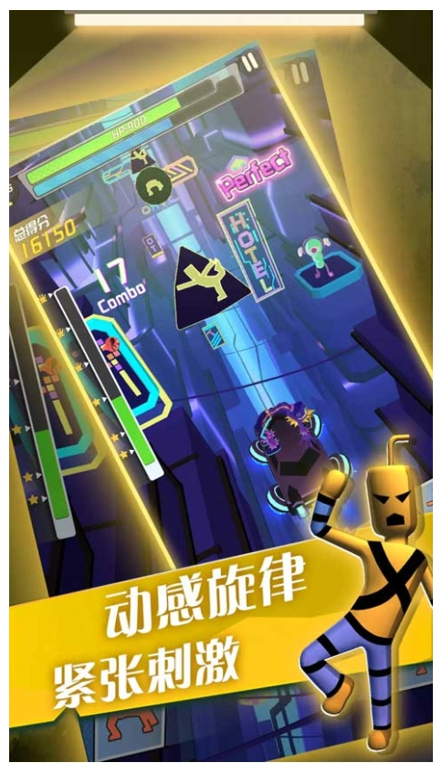 2、控制一个角色跟随音乐的节奏,点击舞毯上的动作,转身穿过快速飞行的墙壁。