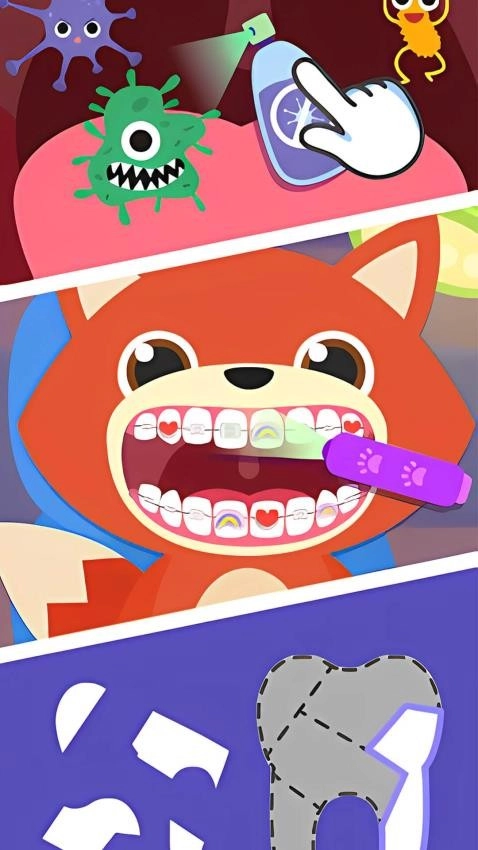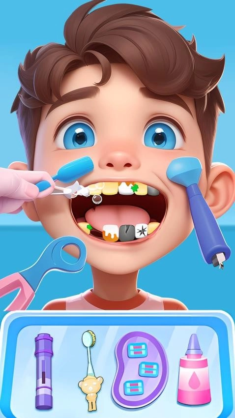玩家可以通过屏幕上出现的各种清洁工具来按照步骤去使用,然后来完成清洁牙齿的任务;
