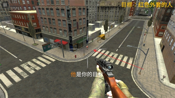 2、在场景中识别红色外套的人,按提示确认其为目标,准备狙击。
