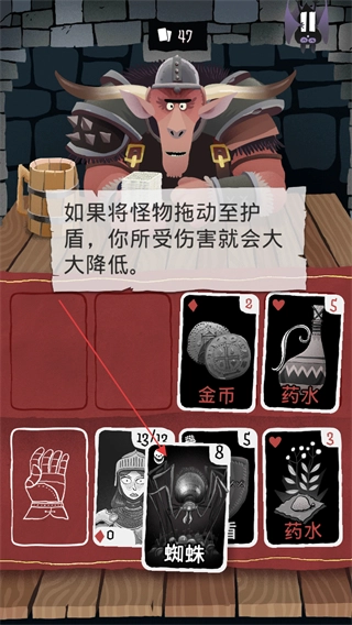 4、按提示将怪物卡牌拖动至护盾处,降低所受伤害,推进卡牌对战流程。