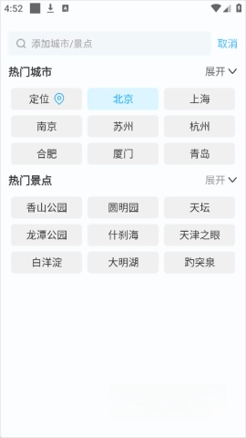 3、输入或选择你想关注的城市名称,确认后即可在首页查看该城市的天气信息。