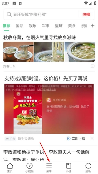 1、启动黑鲨浏览器,在首页找到并点击菜单按钮,随即会弹出功能选项列表。