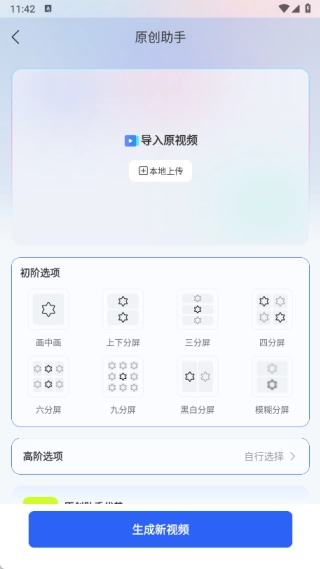 2、点击原创助手按钮,然后导入原视频,选择初阶选项、高阶选项,了解原创助手优势,再生成新视频;