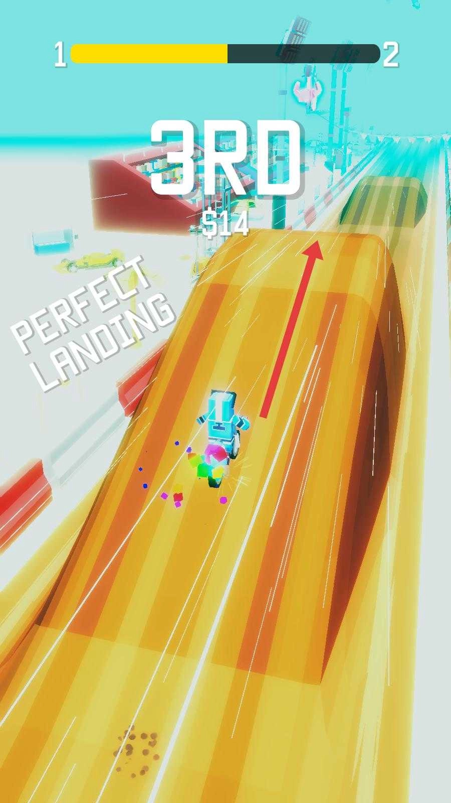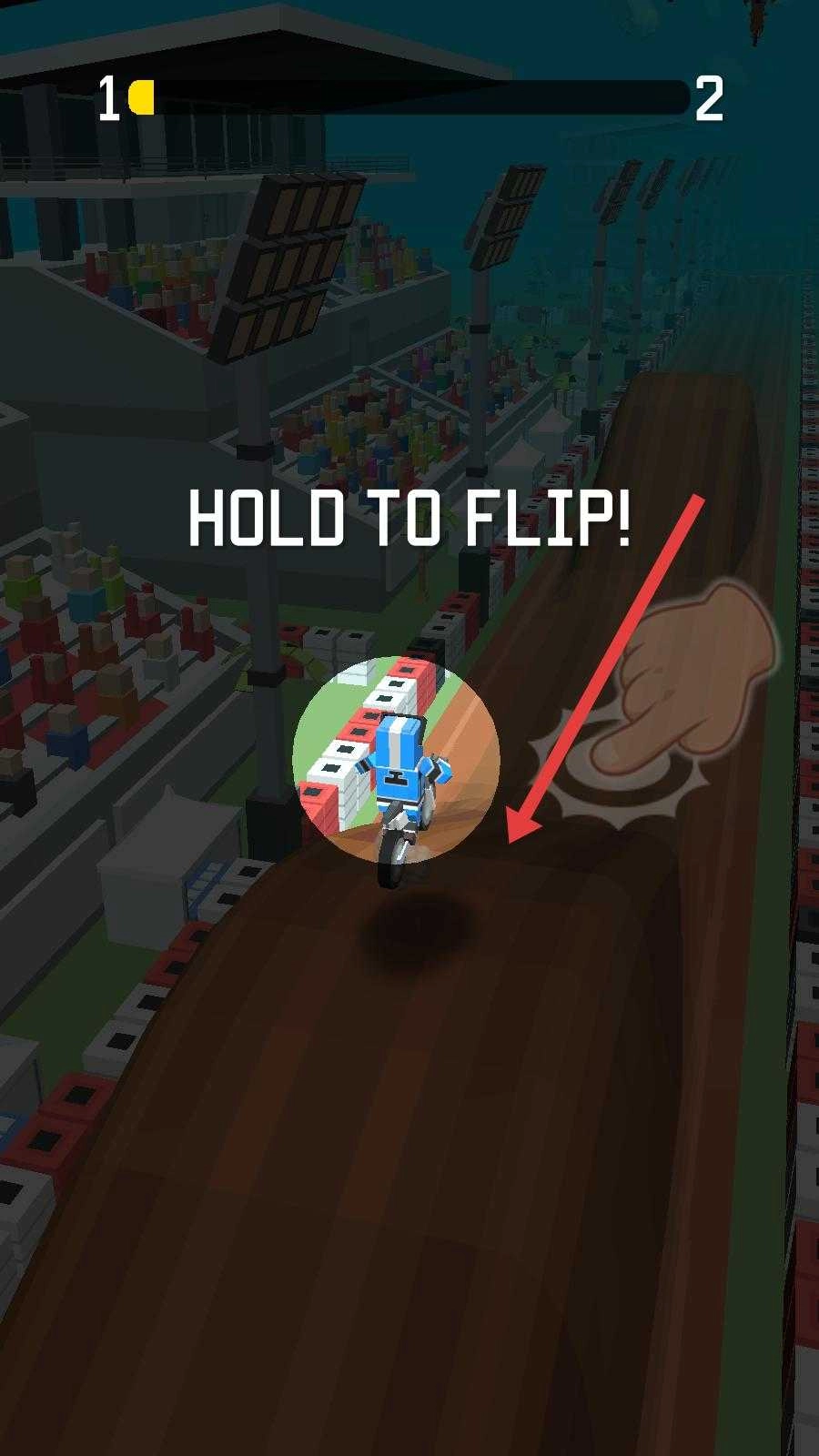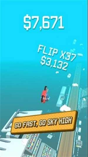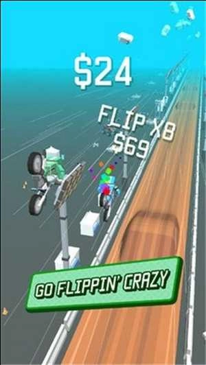2、在赛道遇到坡道等地形时,按住屏幕让摩托翻转,完成特技动作,同时保持摩托的平衡与速度。