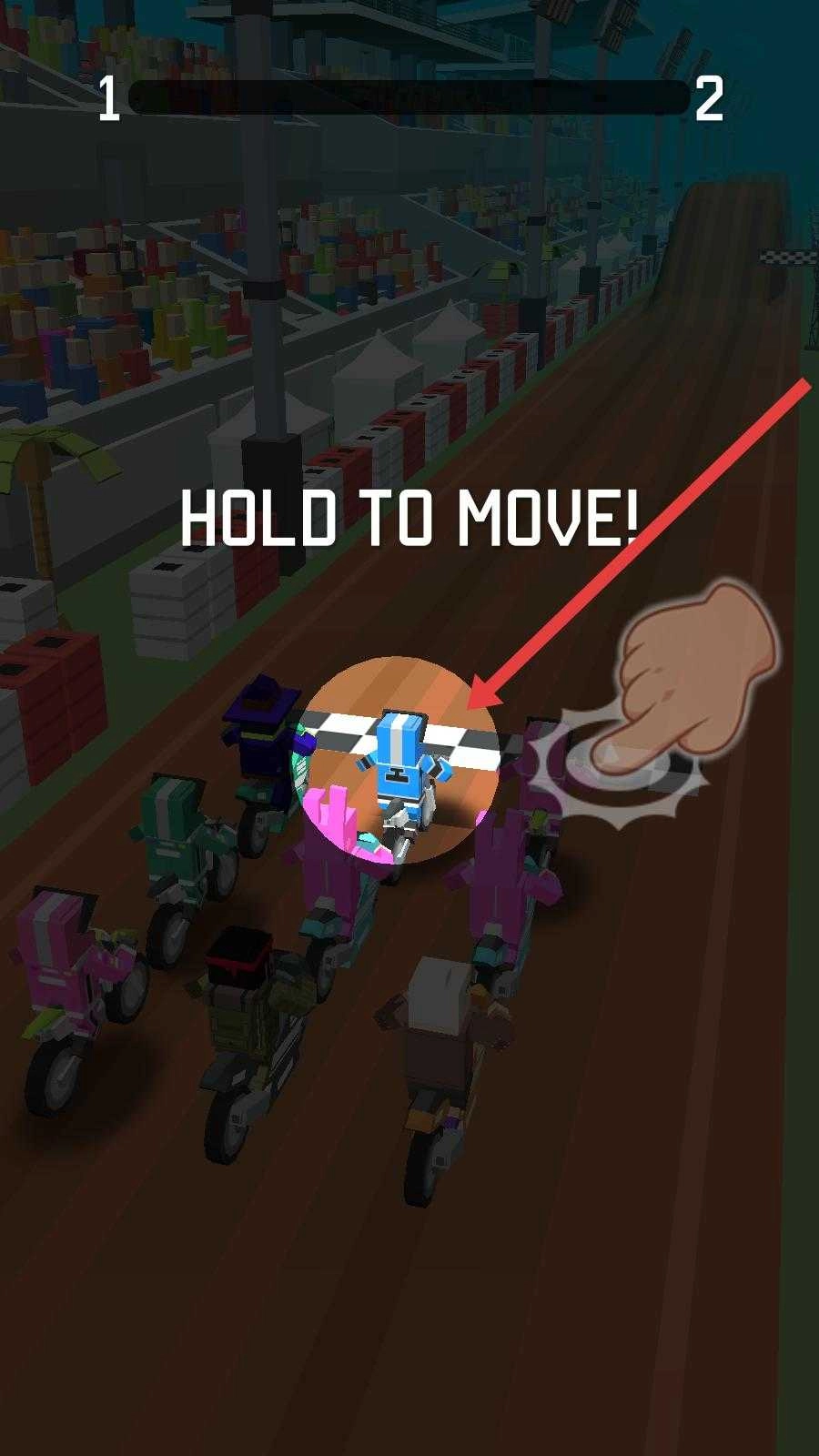1、启动游戏后,根据提示按住屏幕来操控摩托在赛道上行驶,开启摩托竞技征程,和其他选手展开角逐。