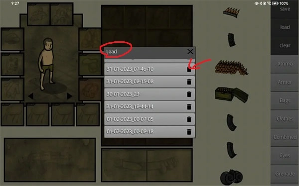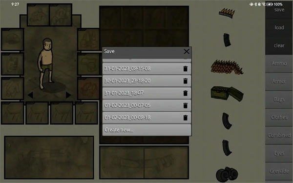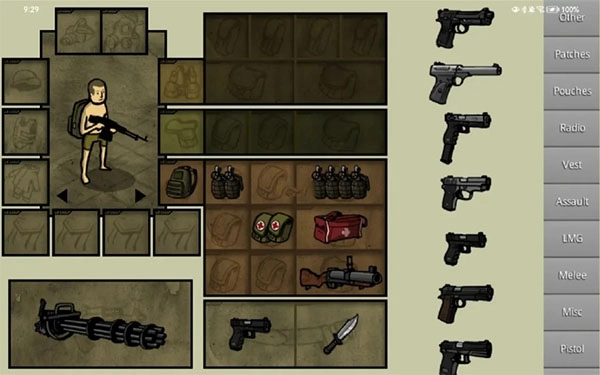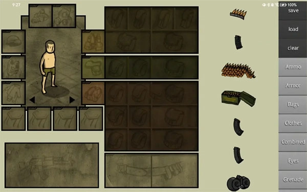 进入游戏首页,游戏开始后可点击右侧一列框中的任意一项(初save.land.clear)每一项为所对应的内容。例:bag为书包和军用背包,eye为夜视仪和战术护目镜。用手拖动至人物四周对应的方框内,如果对应方框错误则无法保留所选物品。注:暗色部分需放置背包等物品解锁贮存空间