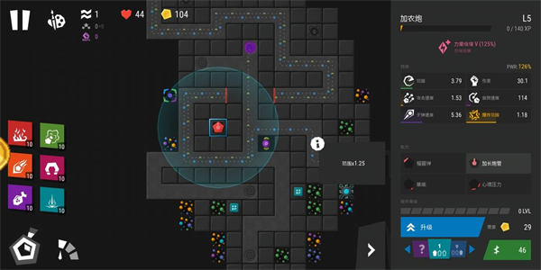 此时我们的加农炮已经接近满级了,周围也该放好了功率伤害攻速芯片。(科技越高防御水平越低,在防御上花的钱就越少因人而异)放几个冷冻塔在关键位置,升级之后的每个冷冻之间不能有缝隙,否则怪会加速然后重新减速。