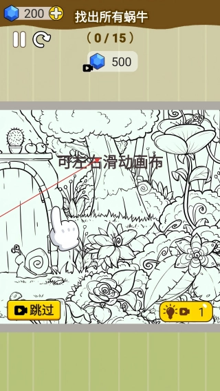 2、按指引左右滑动画布,查找场景里的蜗牛,目标【找出所有蜗牛-0/15】。