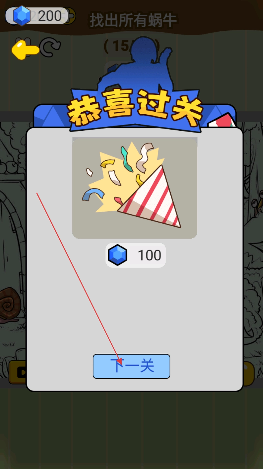 4、找齐15只蜗牛,点击【下一关】,解锁新找物关卡,继续冒险。