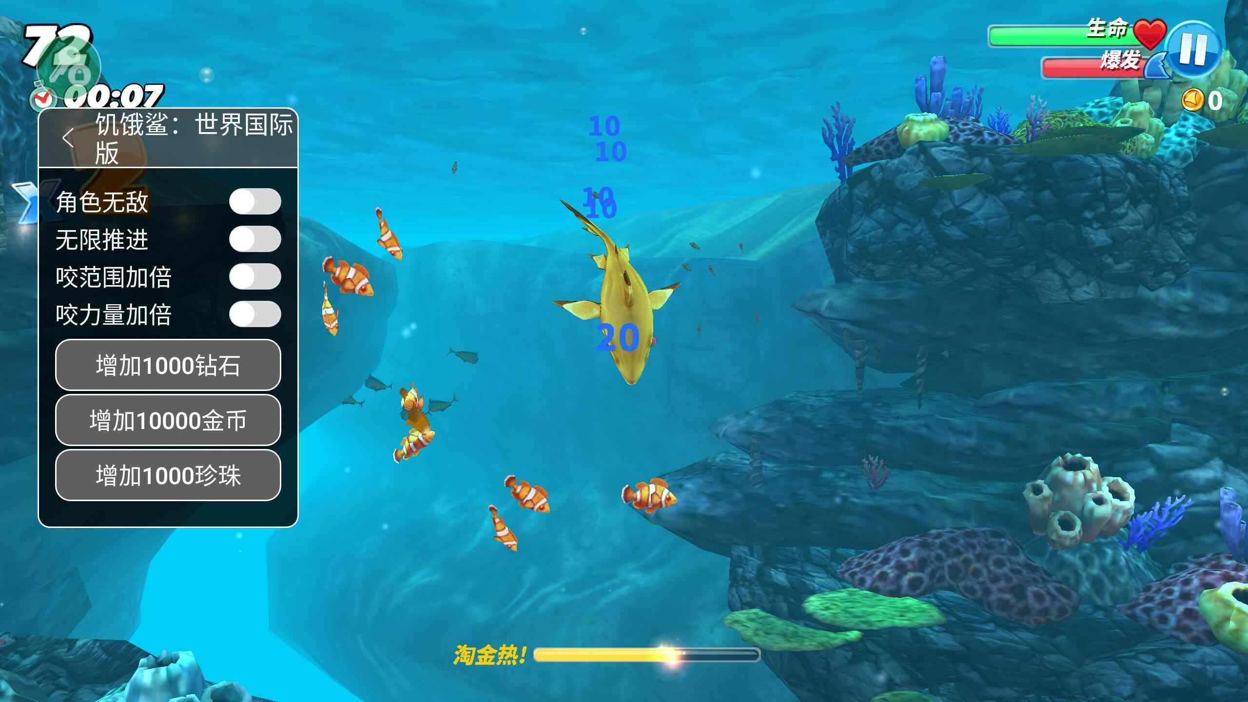 辅助菜单:加金币、加钻石、无限推进、角色无敌、咬的范围加倍、咬力量加倍,新增:加珍珠
