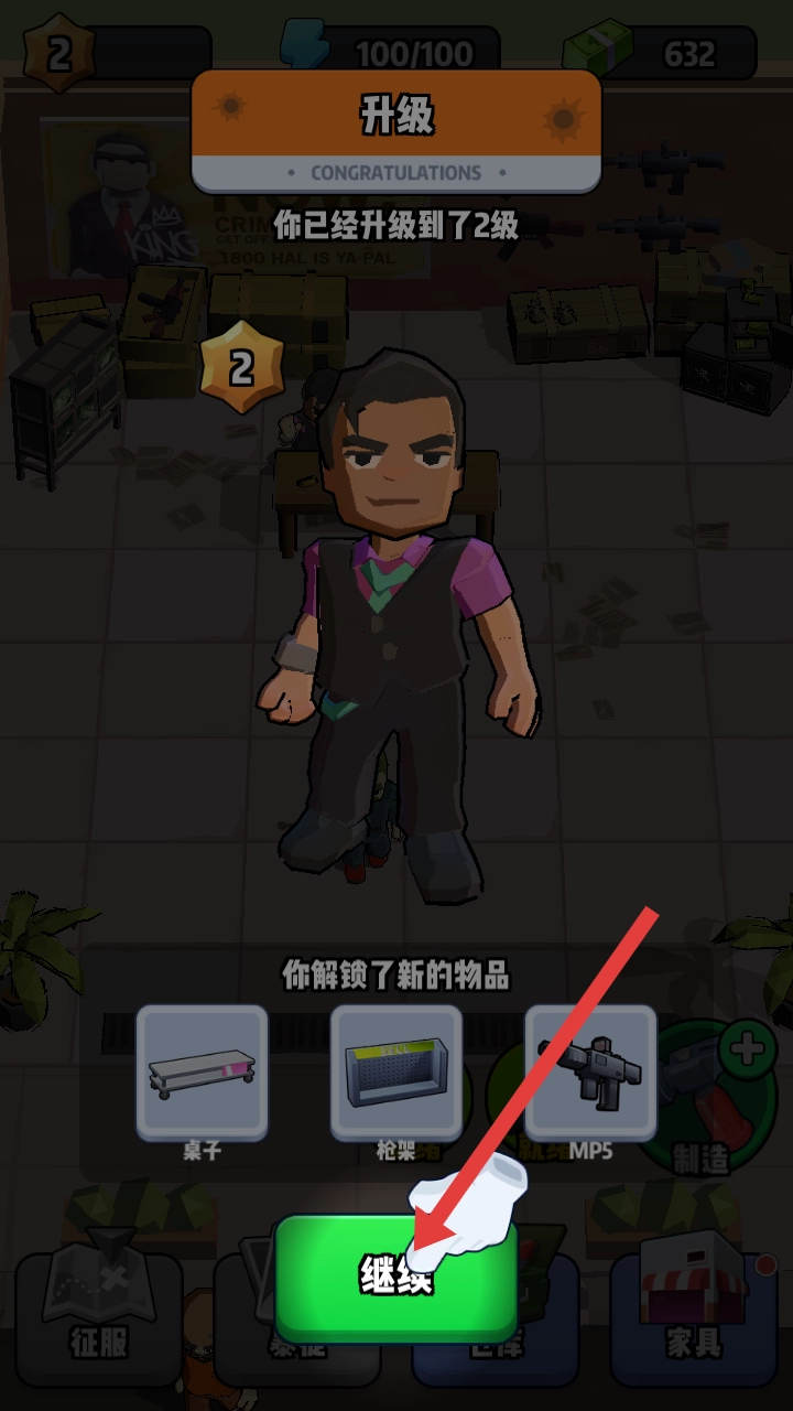 4、当达到升级条件后,会出现升级提示界面,显示解锁的新物品,点击继续,就能进入更高级的游戏阶段。