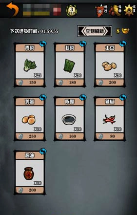 1、华山(13,18)菜贩子处可购买蔬菜,可购买青菜25个(单价150)、韭菜30个(单价180)、土豆30个(单价200)、鸡蛋10个(单价 250)、陈醋10个(单价160)、辣椒10个(单价80)、酱油50个(单价200)。