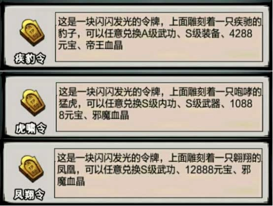 PS:所有的A级武功、S级武功以及S级内功均可通过令牌兑换——疾豹令可兑换任意A级武功,虎啸令可兑换任意S级内功,凤翔令可兑换任意S级武功。