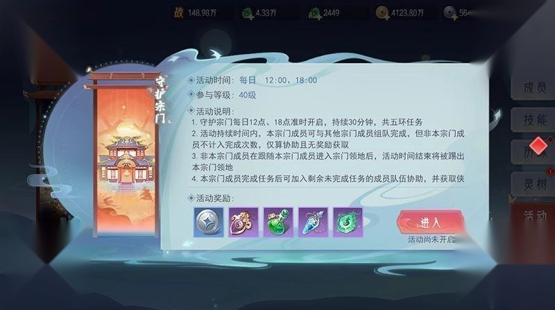 开启后可以与宗门其他成员一起烤火、答题、开启宗门密码宝箱等,在宗门领地场景中还能持续获得经验。