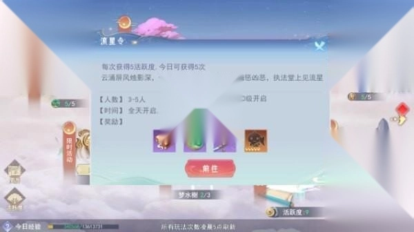 三、流星令/玄宗委托流星令40级开启,玄宗委托49级开启流星令是游戏中的组队日常玩法,可以获取大量的装备和日常材料;而玄宗委托是游戏中单人的日常玩法,完成8环任务后可以获得1次“召唤绘笔”的转盘奖励,有机会直接获得10连抽!