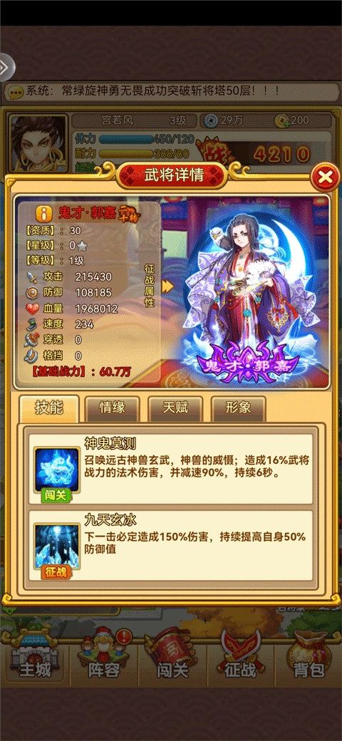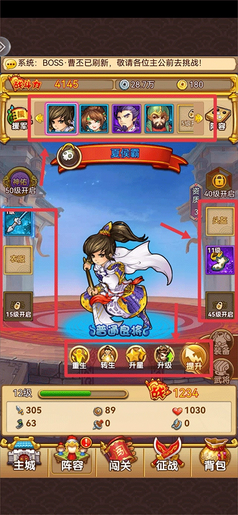 7、若觉得打不过敌人时,你可以在阵容中调整你要上阵的英雄,为英雄穿戴装备、升级等级等来提升英雄的战斗力