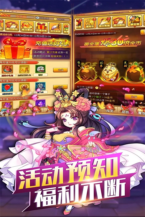 所有武将均可以自由搭配玩法丰富,Q版角色,画风精美,跨服攻城略地开启国战,过关斩将新战略三国,武将收集养成系统,让你战场上猛将如云,后宫里佳丽三千,乱世中用兵伐谋,智取天下,攻城,国战,跨服PK超然征战体验!快开启你的三国征战吧!