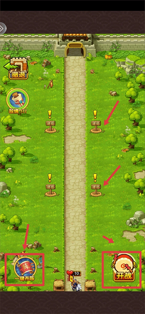 4、进入挑战中,你可以点击一键上阵布置英雄,也可以点击建造将英雄安置在你需要的位置上,安排好后点击开战