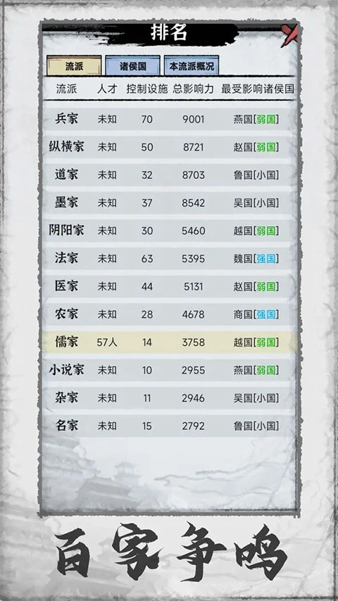 1、选择流派 — 百家学派各有所长,对各方势力的影响程度亦不尽相同,你可自由选择心仪的流派开启管理,秉持自身独特的信念。