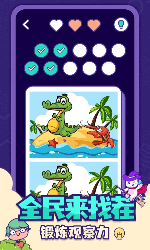 1、海量高清大图等你来找茬,全民找茬游戏丰富多样的关卡挑战,拥有多种干扰因素,你能找齐所有不同之处吗?