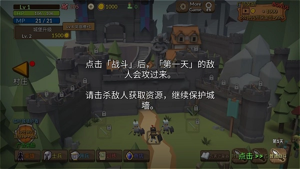 4、准备就绪,点击右下角“战斗”,第一天的敌人会攻过来,请击杀敌人获得资源,并提升城堡防御。