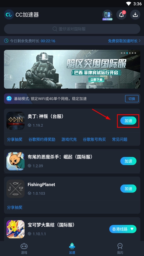 1,先打开CC加速器,接着找到正版的奥丁神叛,点击它右侧的加速按钮;