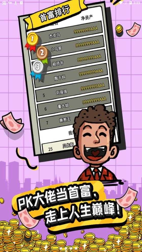 1、这是一款题材新颖、玩法轻松休闲的放置游戏,它鼓励玩家持续探索前进——原本平凡度日的你意外被富豪选中,获得其财产继承权,就此开启逆袭之路,一步步走向人生巅峰。
