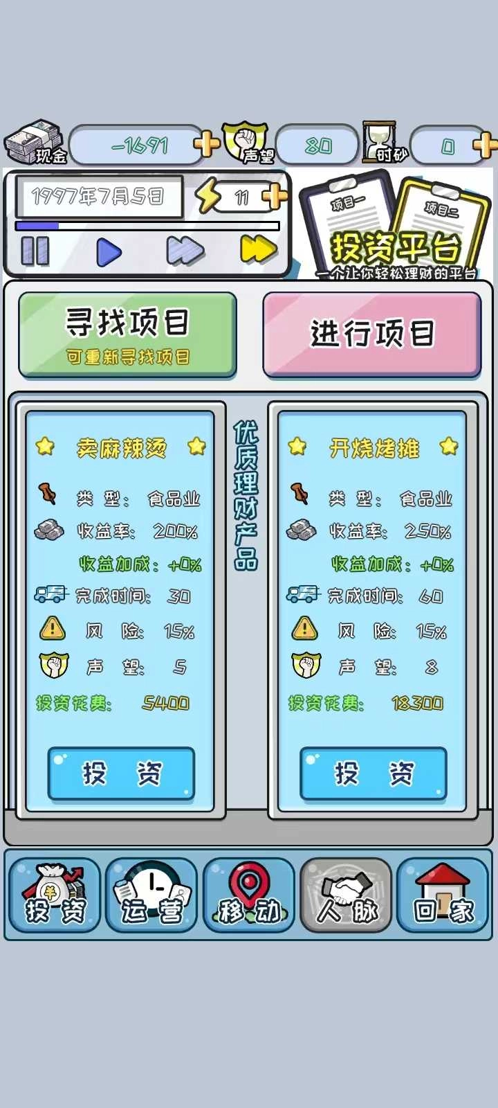 3、投资不同的项目,玩有趣的经营经营游戏,发展自己的公司;