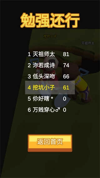 《我坑我自己》是一款休闲益智类趣味挑战游戏,美术风格采用卡通设定,画面精致清新,地图场景丰富多变,人物角色多样,能为玩家带来沉浸式游戏体验!游戏中,玩家需要通过挖坑提升自身实力,同时坑害其他对手,让他们掉进陷阱;还可以用获得的奖励解锁更多挖掘工具,助力后期更轻松挖掘。此外,游戏玩法十分简单:开局玩家手持铲子在竞技场四处挖坑并进行伪装,诱使其他玩家落入陷阱被淘汰,但需注意自己也可能掉进亲手挖的坑,所以要格外小心。另外,若玩家得分达到100分后被他人反坑,分数会直接清零,因此分数积累较多时需谨慎行动,可选择默默等待比赛结束。总而言之,《我坑我自己》拥有爆笑的竞技玩法,无论输赢,有趣的设定都能让玩家感受到别样的竞技精彩与乐趣!感兴趣的玩家不妨体验一番!