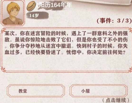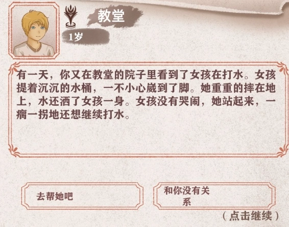 修女目前是唯一的同伴,8岁时去教堂就可以遇到我们可爱的修女啦!如果不去的话,就会与命中少女失之交臂,在好感满的时候就可以加入为同伴,注意哈此时会触发一个事件你身负重伤有两个选项,一个是回家一个是去教堂如果回一家的话,也是会和命中少女失之交臂,如果去教堂修女会变成同伴(没有修女是很难通关的,除非是大佬整活)作用是加血护盾与防御,要注意哈在自己没有能力的时候,要和修女保持距离,好感到二之后就会强制触发一个事件。修女中毒昏迷体制大于50就可以拯救修女,反之修女离开人世…角色只有父亲和母亲,父亲好感没用而且后面会死。母亲好感是增加收入前面说过了(15岁之后还可以去找母亲喝茶增加体力)…