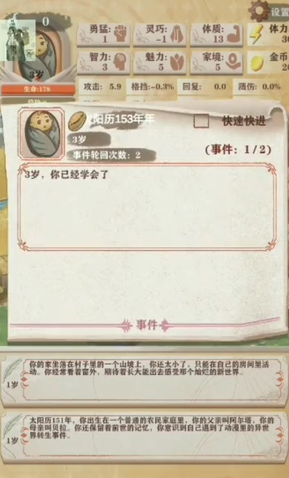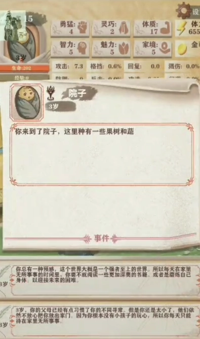 流浪商人:会卖一些神器概率刷属,于特殊事件,十岁前并不会鸟你。农田:可以买个钓鱼竿,在这钓鱼钓鱼可以获得金币的,后面会有功夫奶奶,增加灵巧。