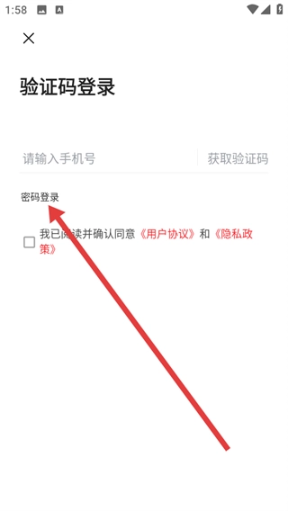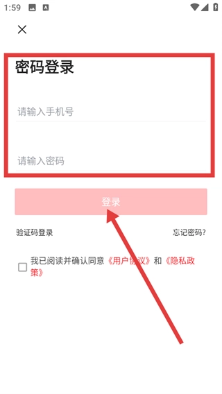 4、在密码登录页面,输入手机号和密码,勾选同意后,点击登录按钮,完成登录。