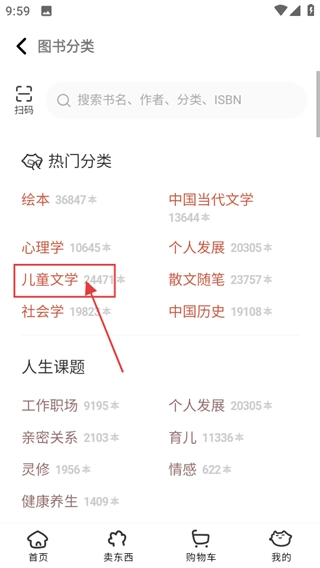 2、在图书分类页面,选择儿童文学分类,进入儿童文学图书页面。