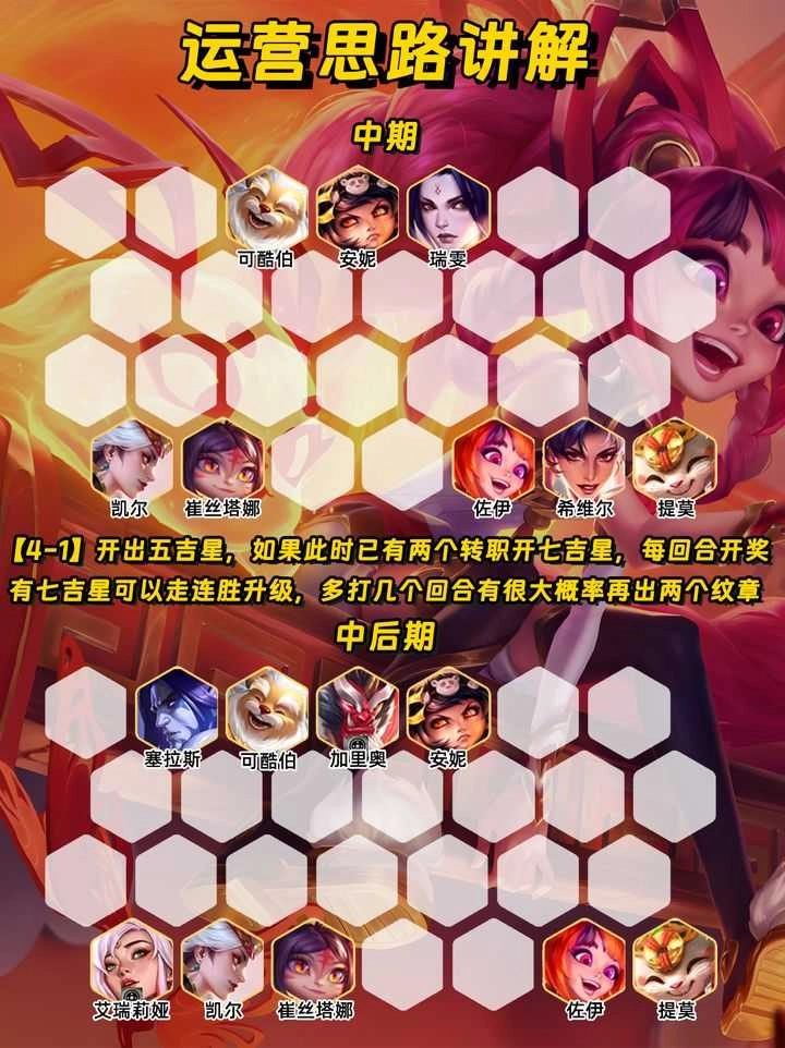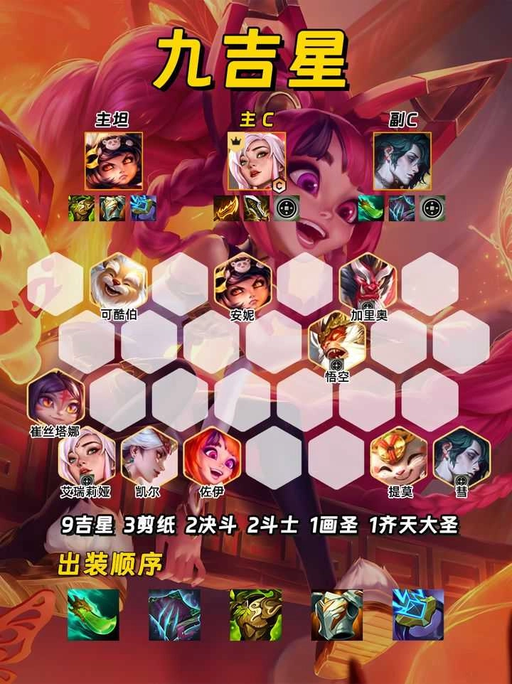 有2个吉星转职开出7吉星,接下来就可以打连胜,7吉星每回合都是30多层,只要多打几个回合很大概率开出9吉星,此时只要尽快上到九人口,九人口九吉星之后就可以下掉吉星棋子,发财树也不会消失,直接升十级,开始爽追三星五费即可