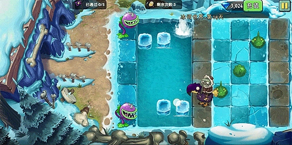 然后就是浮冰这一块,左数第一、二、三列,会出现纵向浮冰,一、三列是从下到上,二列是从上到下。玩家需要踩着浮冰去到对岸,同时也要规避在岸上的食人花。很多人都容易在这里有失误,导致过关失败,主要有两点:浮冰跳跃时机没有把控好和被大嘴花吃掉。
