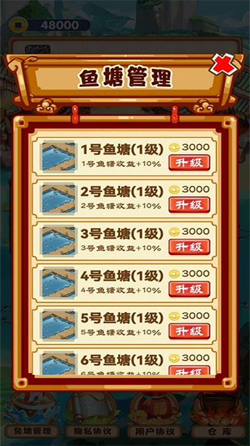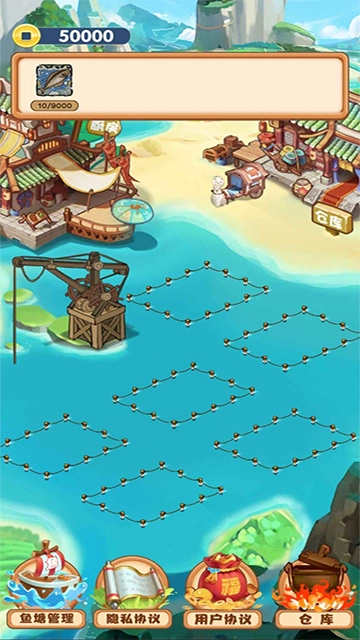 1、游戏启动后,玩家会看到六个待运营的空闲鱼塘。