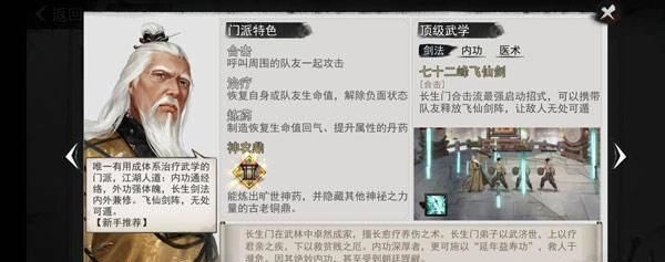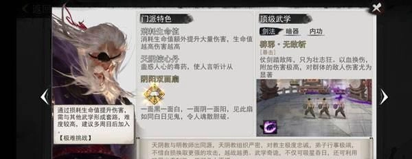 2.选择五岳开局前期高强度,使用五岳剑法,在PVE通关上伤害更高,拥有丰富残章,门派任务稍微有点难,不过升级也可以过去;