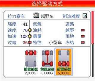 选择驱动方式,不同的驱动给车辆提供的属性提升与道路适应能力都是不一样的,而且并不是只有这三种引擎,后续还有更多哦~