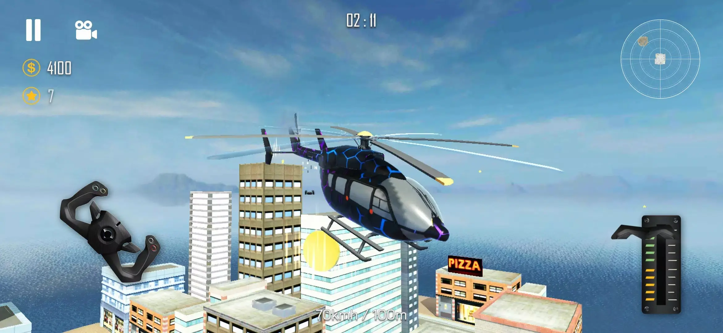 7、点击启动按钮后,通过前后左右推动左侧摇杆调整直升机的高度变化,滑动右侧虚拟摇杆调节飞行方向。
