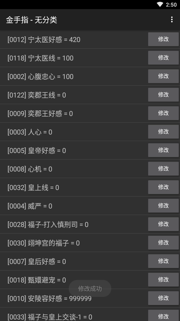 要---分高下,威严加3,一视同仁心机加3----大张旗鼓威严加3心机减3好感加2,不显山漏水心机加3好感加3,不填置心机人心加3---从上到下分别加威严,心腹,人心---伴圣加威严心机,好人家加心机人心,皇后加人心----选好人家分线争宠皇上好感加3,选少一个人陷入困境加另两人好感3---选伴圣分线,心酸假皇上好感3无感加另两人好感3,看不看都行不加属性好感 【新人入宫拜见】华贵加威严3,大气加人心3,朴素减心机3(大气谦和是对的)----要,威严加3,不要,人心加3----故意人心减2威严加3,态度平和人心加3心机加3,平易近人,心机减3----夸谁加谁好感 ----先她一步走上去人心威严加2,静观其变人心加2,第一个第二个分别加眉庄陵容好感最后一个减属性,相反方向走去人心加2心机加3-----攻略谁给谁送信攻略奕亲王不送-----接下来是不同线了