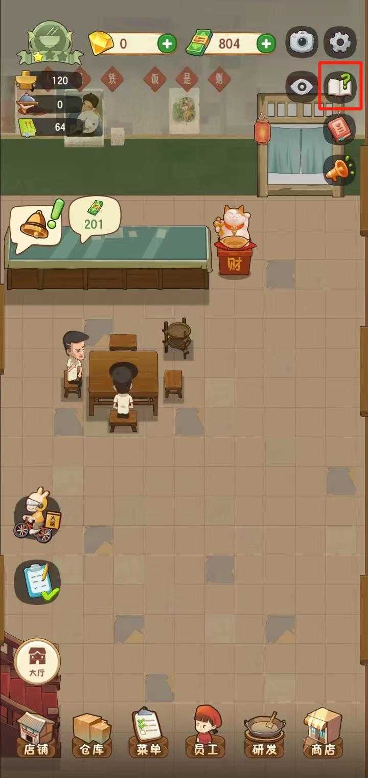 9、现在我们可以准备迎接客人的到来,客人来了,可以点击客人头上的需求,对其进行上菜;上完菜后点击客人头上的钞票就可以查看消费的金额以及所得的利润;