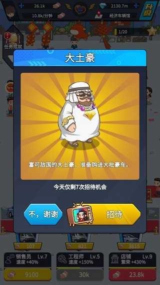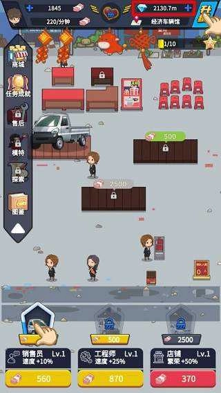 赚取收益后升级汽车、销售员、工程师,解锁更多汽车和玩法;