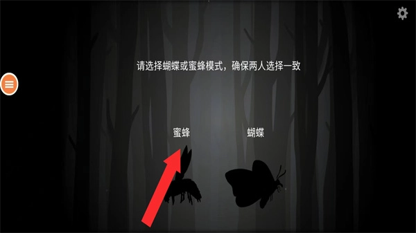 2、后续在模式选择界面,点击红色箭头指向的蜜蜂选项需与另一角色选择一致,完成双人统一选择的剧情要求。