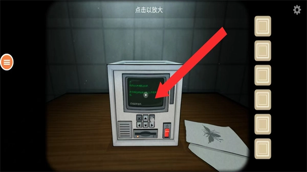 3、进入房间场景后,点击红色箭头指向的老式电脑屏幕,放大查看设备信息,获取剧情相关的提示内容。