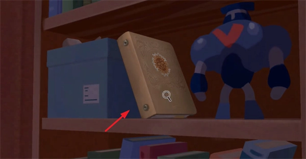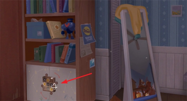 3、再点击左侧的按键,直接切换场景,选择书柜下面的机关。