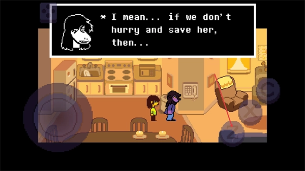 1、进入该像素风格的室内场景后,操控左侧的移动控件来控制角色在场景内移动,可尝试与场景中的其他角色进行互动以推进剧情。