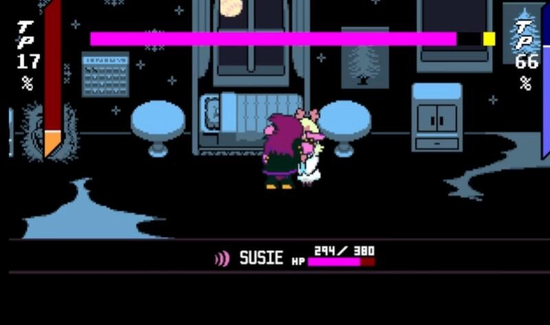 17、这款作品的战斗系统挺有意思的。和《传说之下》类似,它也提供了无需攻击就能结束战斗的途径:首先要在ACT选项中执行对应的互动操作,等怪物名字的颜色产生变化后,就能选择宽恕,以此来解决战斗。游玩过程中不用太担心角色血量,因为角色自带回血技能。使用技能会消耗TP点数,而TP可以通过执行行动或发起攻击来积累。