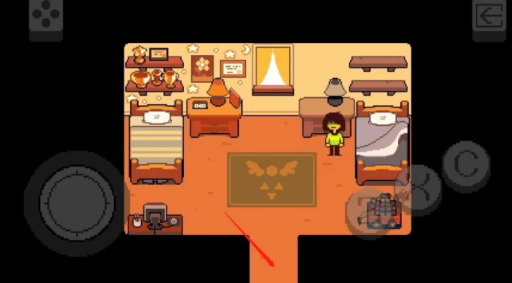 4、接下来便正式进入游戏环节,托丽尔呼唤着克里斯(Kris)的名字,提醒他上学别迟到,此时按“乙”键可推进剧情,玩家需操控Kris起床并前往学校;滑动左侧的控件,引导Kris走到箭头所指的位置,随后场景便会切换至下一处。
