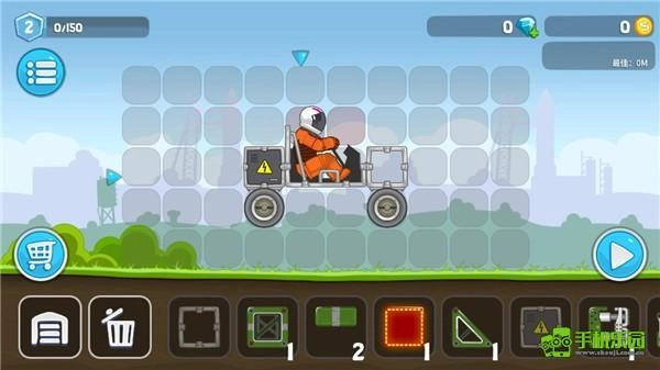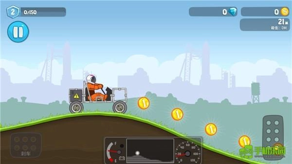 3、把赛车改造完成后就能出发了,左边是刹车键,右边是油门键,要是车头翘起来就踩刹车,车尾翘起来就踩油门,我们的目标就是操控赛车在能量用完之前到达终点,就是这么简单。