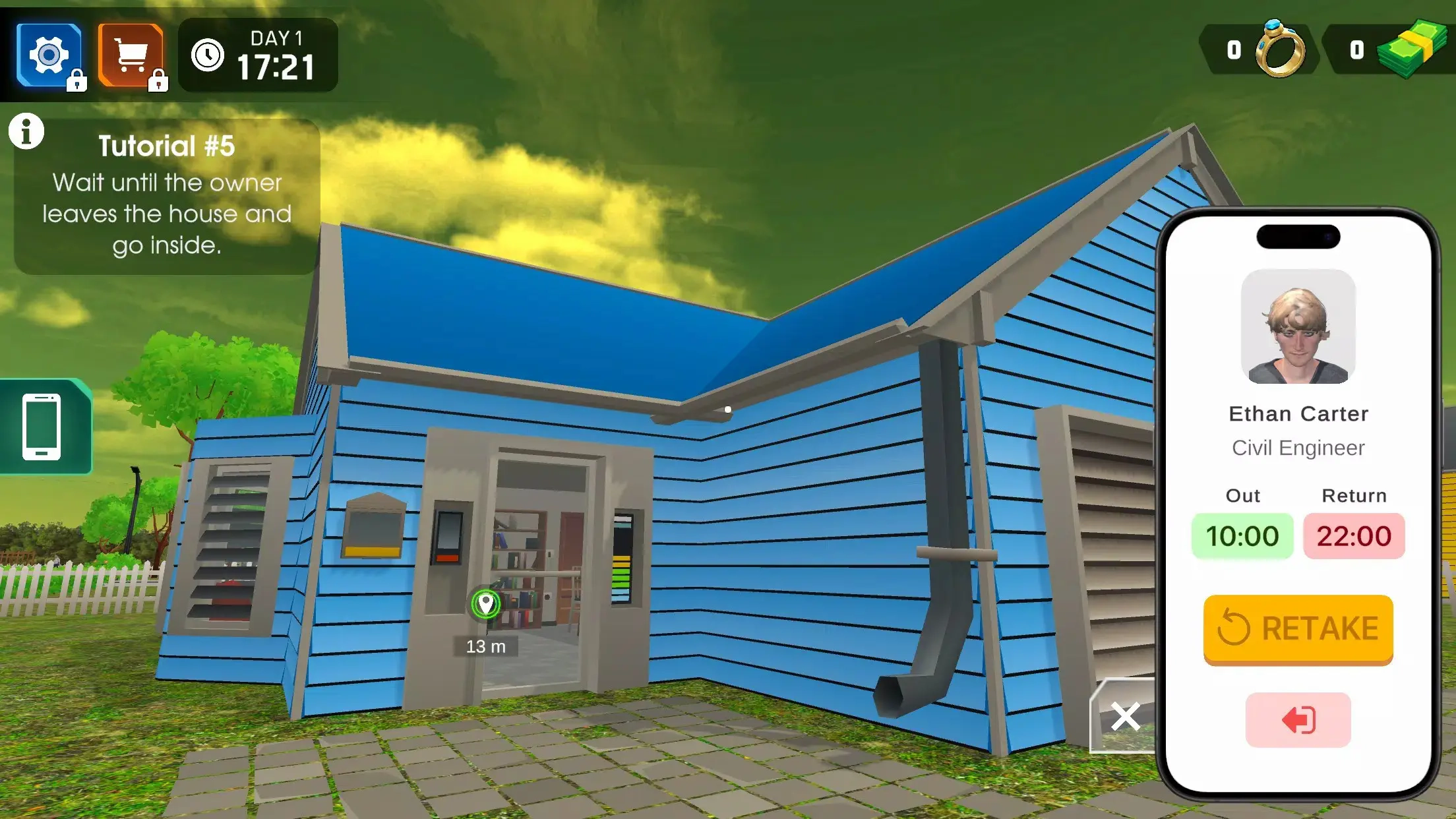 探索充满车辆、NPC 和各种房屋的广阔城市。找到完美的房屋进行抢劫,等待主人离开,然后用你值得信赖的开锁器闯入。